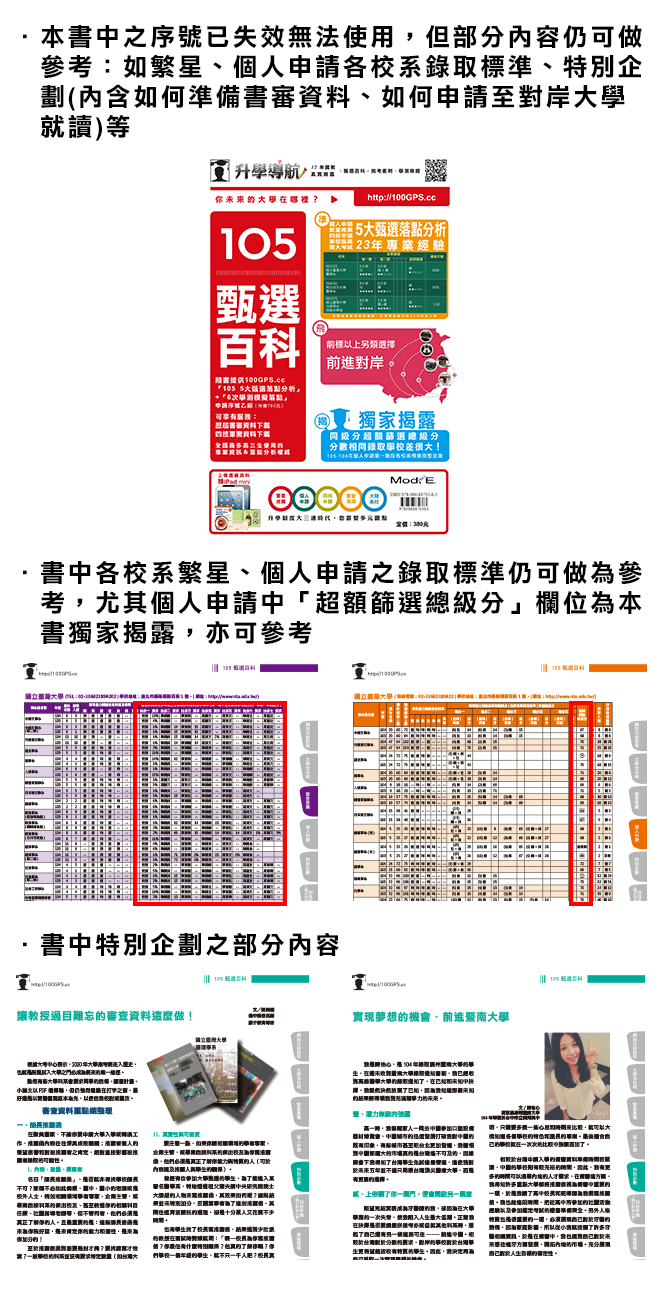 本書包含五大甄選(個人申請、繁星推薦、四技申請、軍校甄選以及警大考試)104與103之各校系的錄取級分的升降、採計科目組合以及校系招生人數的變化,從中亦可觀察出社會評價,瞭解就業市場需求變遷等。