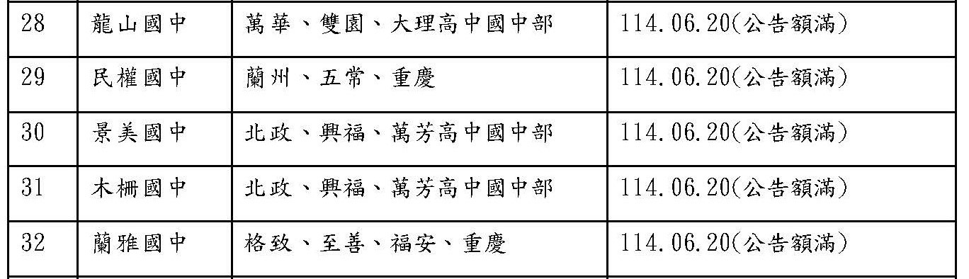 114學年臺北市公立額滿國中7年級國一入學生暨改分發學校名單
