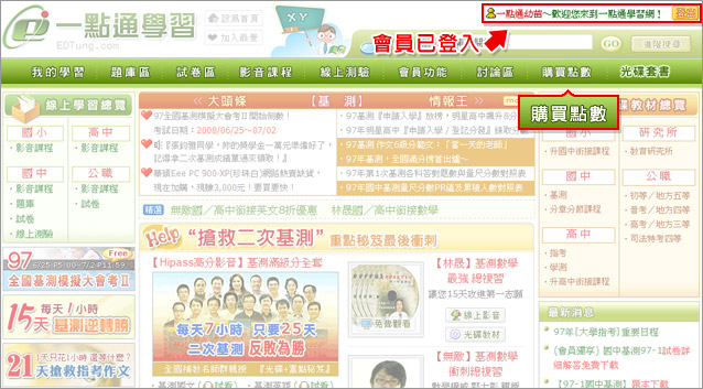 會員登入後,點選一點通學習網上方的「購買點數」選項。