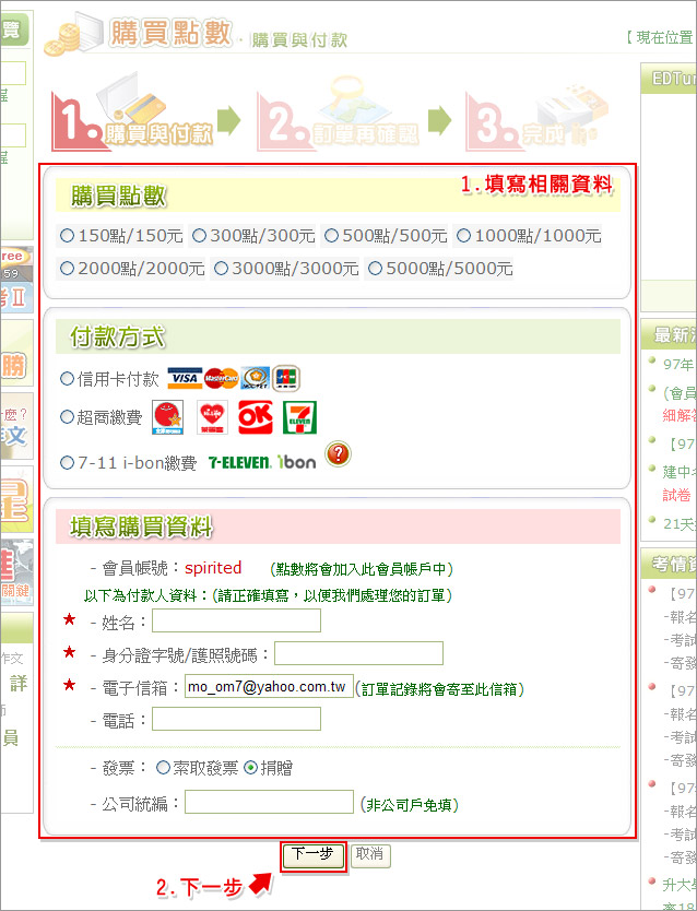 填寫相關資料(購買點數/付款方式/購買資料)後,點選「下一步」。
