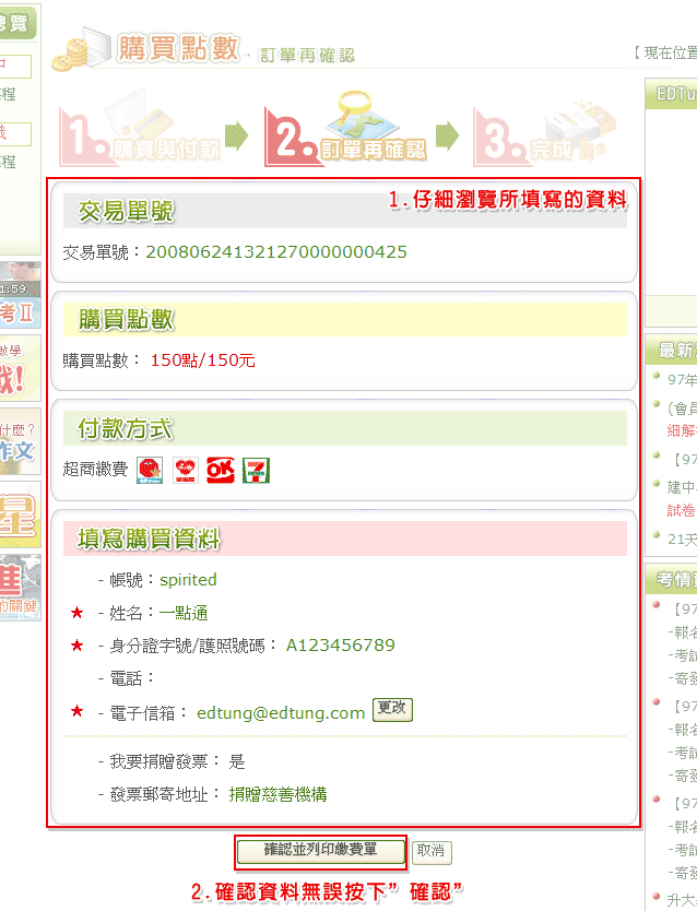 仔細瀏覽您所填寫的相關資料,如果資料無誤請按下「確認」。
